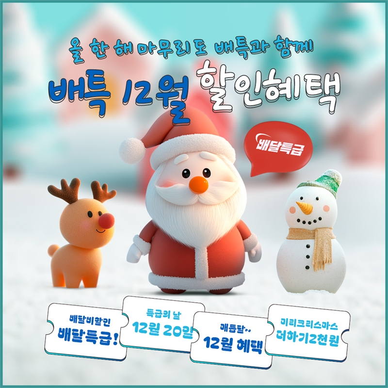 경기도가 오는 19일까지 가평군, 연천군, 포천시, 화성시, 과천시, 안산시, 양주시, 동두천시 등 8개 지역을 대상으로 공공배달앱 배달특급인 '미리크리스마스' 소비자 프로모션을 진행한다. 해당 지역 소비자들은 2만원 주문 시 4천원을 할인 받을 수 있다. 사진=경기도