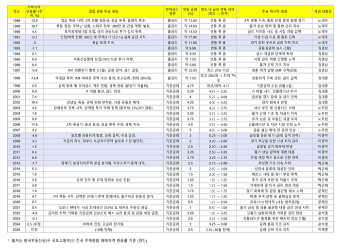 <Google Gemini 도움을 받아 작성한 1988년이후 주택가격변동율과 정책금리 변화>