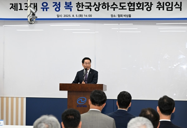 지난 8월 5일 유정복 인천시장이 전국 상하수도협회 회장에 취임하면서 인사말을 하고 있다. 인천시는 정비사업지구 내의 수도시설 비용 부담과 관련 사업시행사인 LH와 7년 소송 끝에 최종 승소해. 향후 전국 지방자치단체 상하수도 사업에 큰 영향일 미칠 것으로 보인다. 사진=인천시