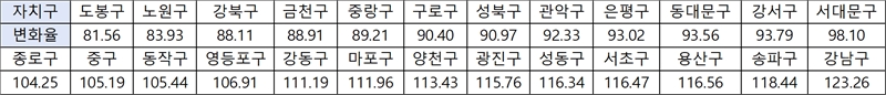 다음 표는 KB아파트매매가격지수를 토대로 2022년 1월 10일의 가격을 100이라고 할 때 2025년 10월 20일 현재의 자치구별 매매가격 변화율이다. 서울지역만을 가지고 분석해 보았으나 25개 자치구중 12개 자치구는 아직도 2022년 1월 10일의 집값을 회복하지 못하고 있다.