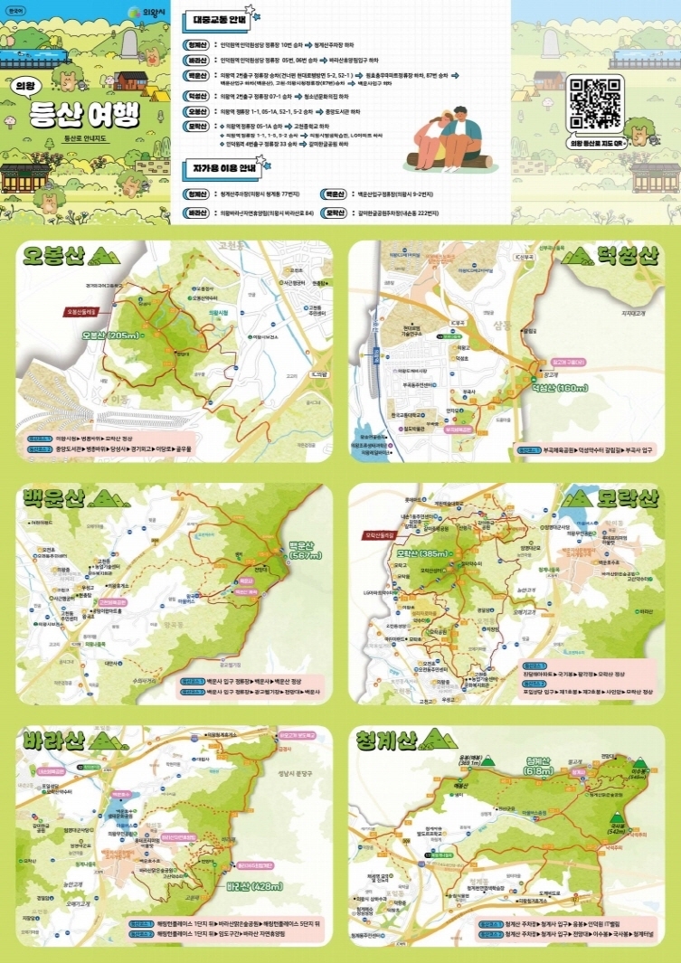 스마트 산행 안내지도에는 의왕시 내 모락산, 백운산, 오봉산, 덕성산, 바라산, 청계산 등 6개 산의 등산로, 둘레길, 맨발길 등 주요 산행로가 담겨있다. 리플릿 형태로 8000부를 제작해 주요 등산로 입구와 각 동 주민센터에도 배포했다.