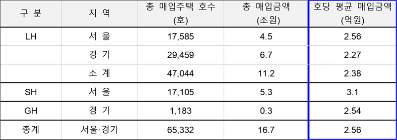 위와 같은 분석은 별론으로 하고, 경실련 보도 자료에 의하더라도 2021~2024년까지 총 매입금액과 총매입호수는 나오니 호당 얼마 꼴인지 가격은 금방 계산할 수 있다. 즉, 매입임대주택(오피스텔) 1채의 평균가격은 GH공사가 2.54억원, LH공사가 2.38억원, SH공사는 3.1억원이다.