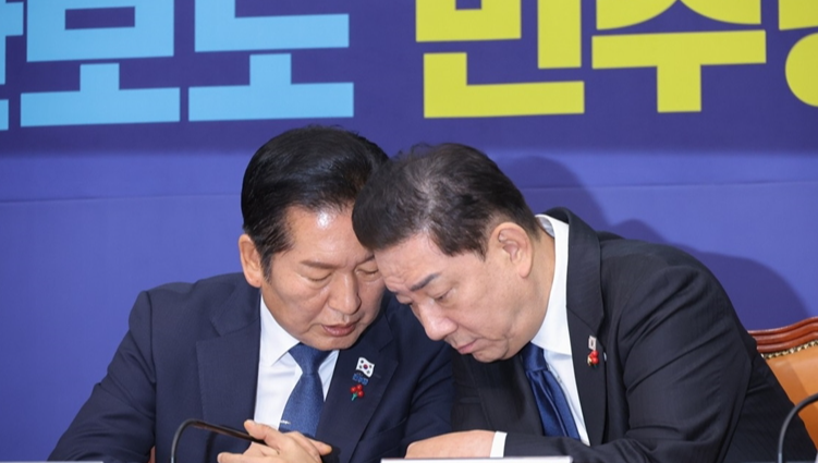 더불어민주당 정청래 대표와 김병기 원내대표가 협의를 하고 있다. 사진=연합뉴스