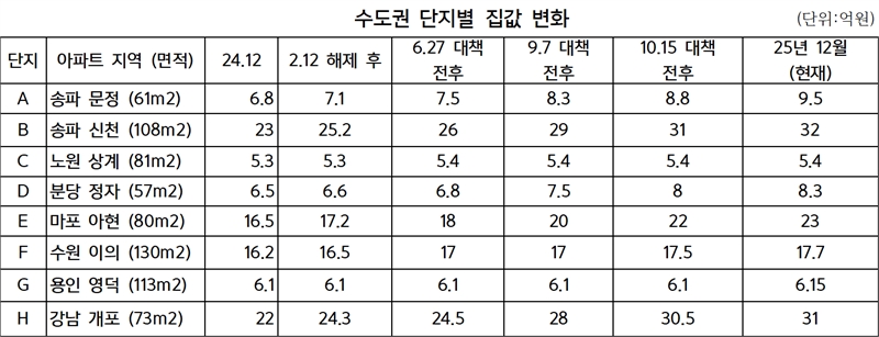 노원, 용인 지역은 대책 시점과 관계없이 1년 내내 거의 평행선을 유지하고 있다. 부동산 대책이 모든 지역에 영향을 미치기보다, 특정 선호 지역에만 수요가 몰리는 '극심한 양극화'가 있었음이 수치로 증명된다. 위 데이터는 각 정책이 발표될 때마다 규제 지역의 희소성이 오히려 부각되면서 가격 상승을 자극했던 2025년 부동산 시장의 흐름을 명확히 보여주고 있다.