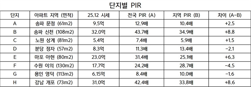 위 단지들을 4인 가구 기준 중위소득 연 환산액인 전국 7,317만원, 서울 9,173만원, 경기 6,174만원으로 계산했을 때 각 아파트의 전국 및 지역PIR은 다음과 같다(통계청 및 KB자료).