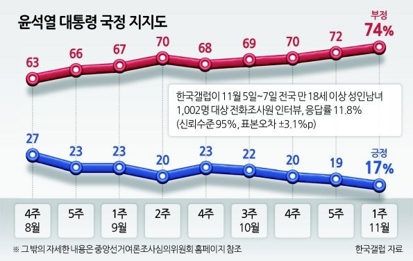 윤석열 전 대통령의 국정지지도 추이. 취임 이후 내내 낮은 긍정평가와 높은 부정평가가 이어졌으며, 결국 총선 참패에 이어 비상계엄 선포라는 오판까지 하게 되는 계기가 됐다. 12.3 비상계엄 선포 전에는 긍정평가가 10%대로 내려갔고 부정평가는 70%대가 지속됐다.(참고용 그래프)