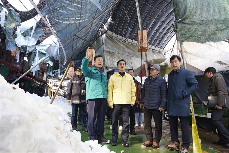 지난해 11월 폭설로 무너진 의왕시 도깨비시장 아케이드 현장을 2024년 11월 28일 김성제 의왕시장과 김동연 경기도지사가 점검하고 있다. 사진=경기도